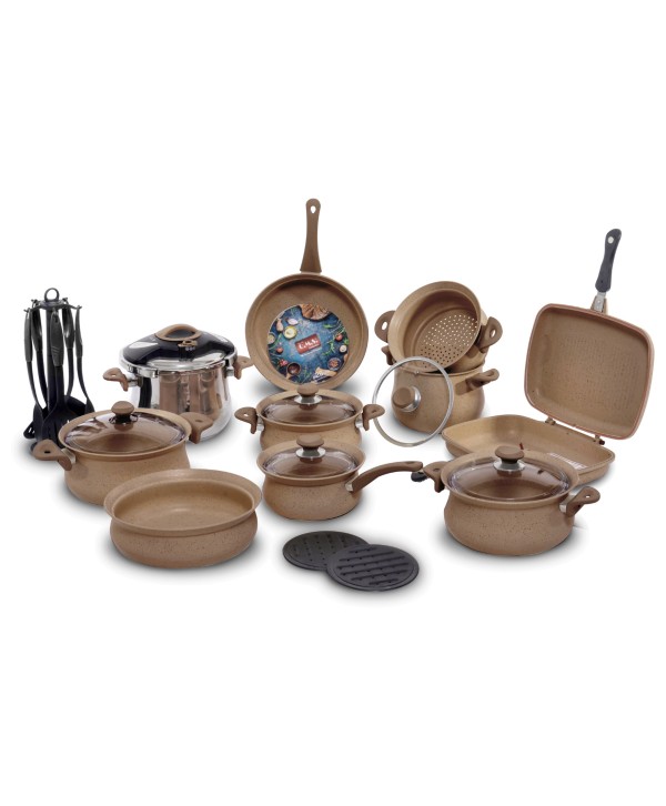 La batterie de cuisine AKY 32 pièces est un ensemble ultra-complet conçu pour une expérience culinaire optimale. Elle comprend une variété de casseroles, poêles et faitouts avec un revêtement antiadhésif de haute qualité, garantissant une cuisson homogène et un nettoyage facile.