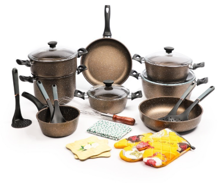 • La batterie de cuisine AKY 26 pièces est un ensemble complet et polyvalent conçu pour répondre à tous vos besoins en cuisine. Elle comprend des casseroles et des poêles de différentes tailles avec un revêtement antiadhésif de haute qualité, garantissant une cuisson saine et un nettoyage facile.