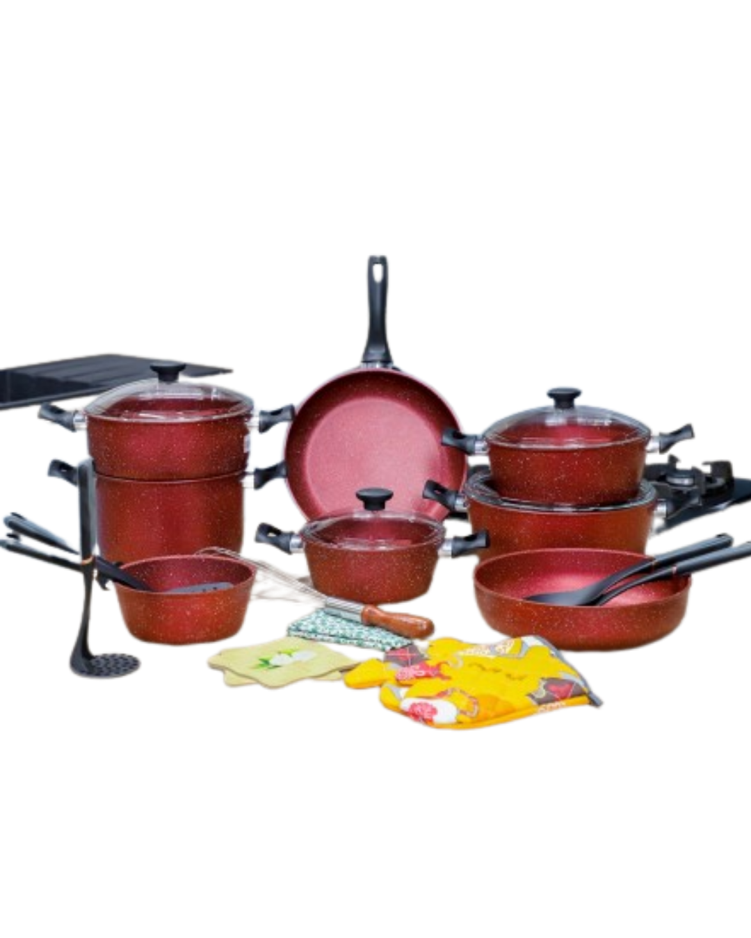 Batterie de cuisine AKY 30 pièces, idéale pour une cuisine polyvalente. Comprend casseroles, poêles, ustensiles et accessoires essentiels avec revêtement antiadhésif pour une cuisson sans effort. Compatible avec toutes les sources de chaleur.