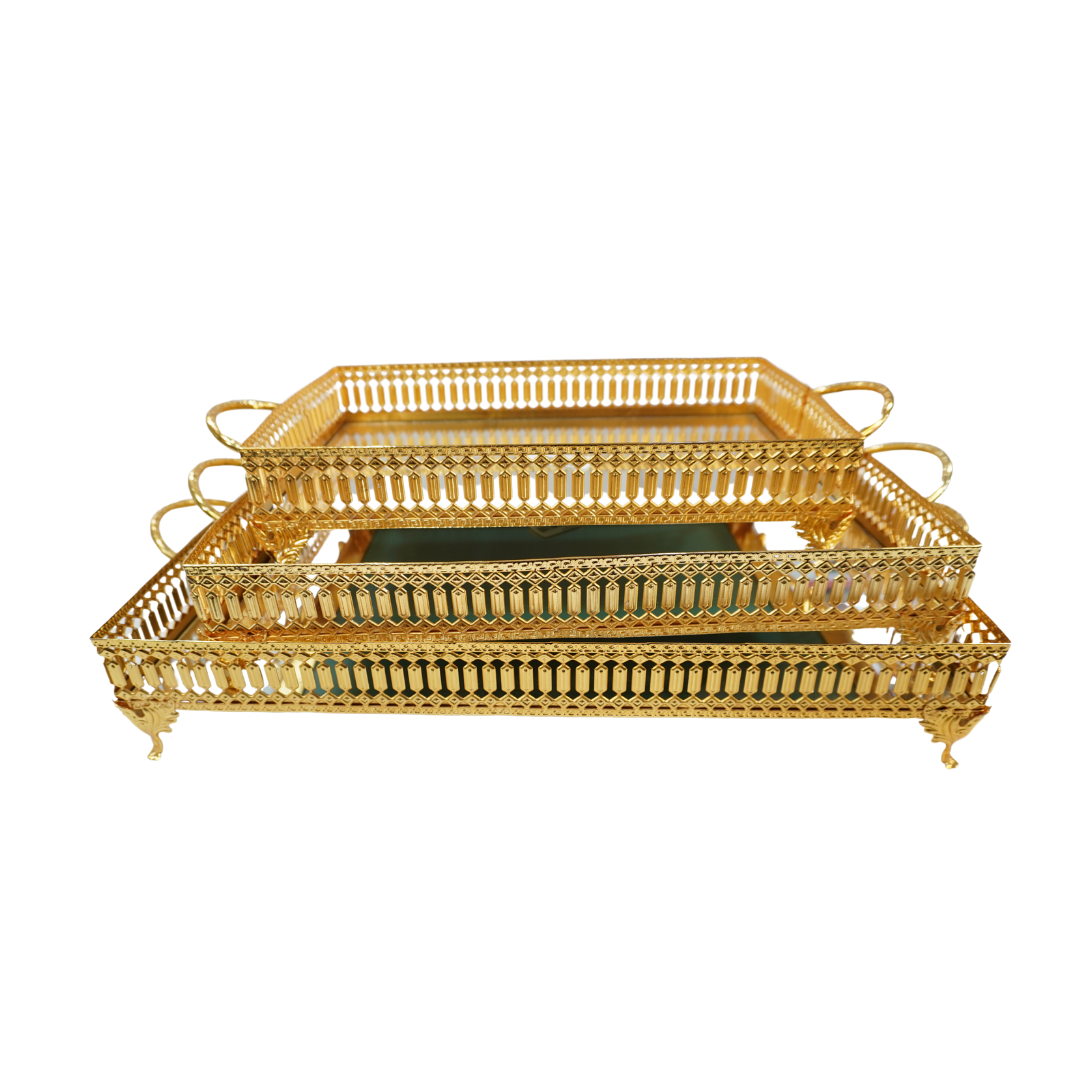 Laissez-vous séduire par le raffinement de cet ensemble de trois plateaux dorés, alliant élégance artisanale et finesse orientale. Chaque pièce est soigneusement conçue avec un cadre métallique doré aux motifs floraux ajourés, mettant en valeur une base en miroir qui reflète subtilement la lumière et les objets posés dessus. Leur design luxueux et intemporel transforme vos présentations en véritables œuvres d’art, que ce soit pour un mariage, une réception ou une décoration d’intérieur. Empilables et modulables, ces plateaux s’adaptent à toutes vos envies : service de thé, pâtisseries, parfums, ou simple décoration. Un incontournable pour les amoureux du détail et du chic.