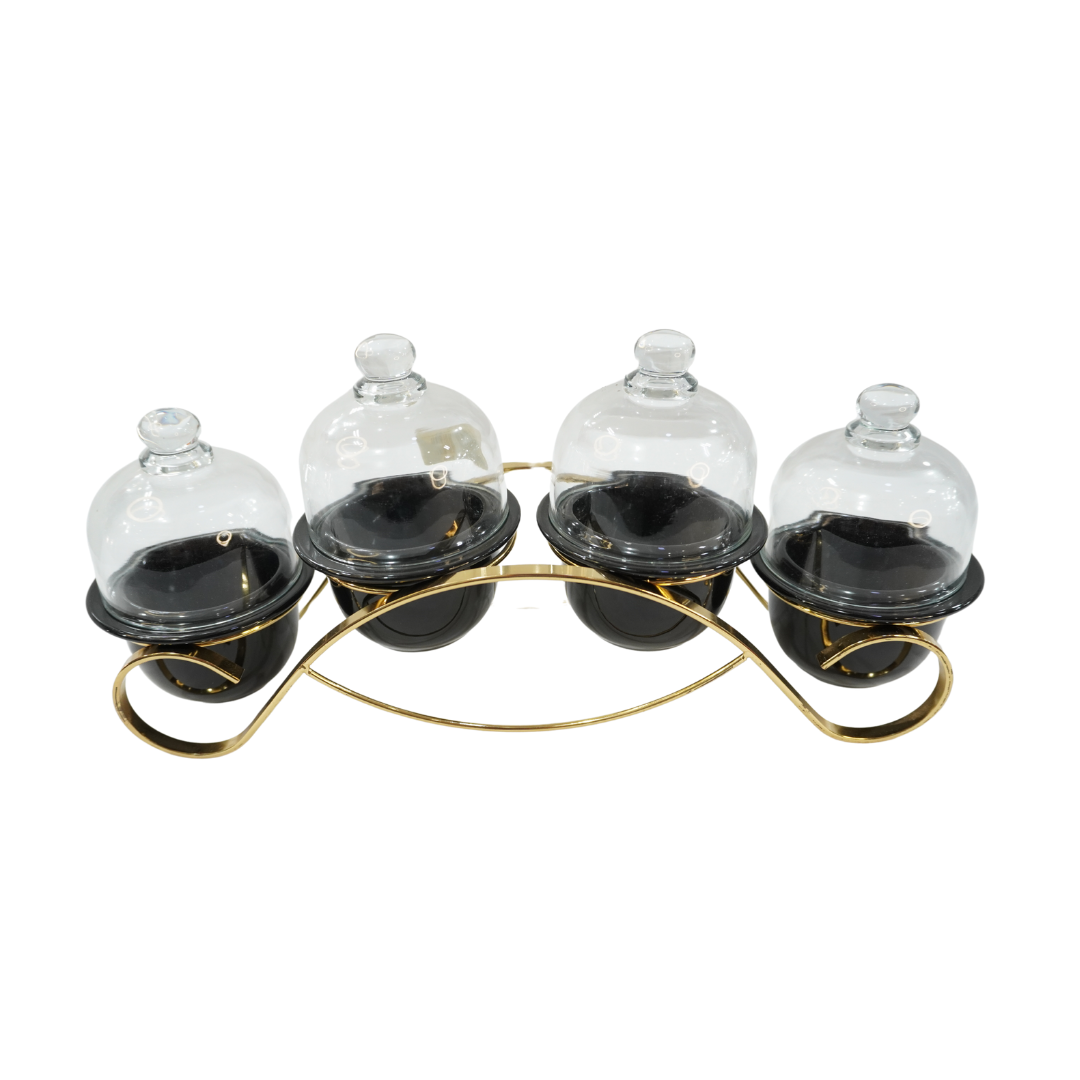 Contenu : 4 pots ronds moitié verre noir et moitié verre transparent Dimensions approximatives : Support : 35 cm (L) x 15 cm (H) x 12 cm (P) Pots : 8 cm (diamètre) x 9 cm (hauteur)