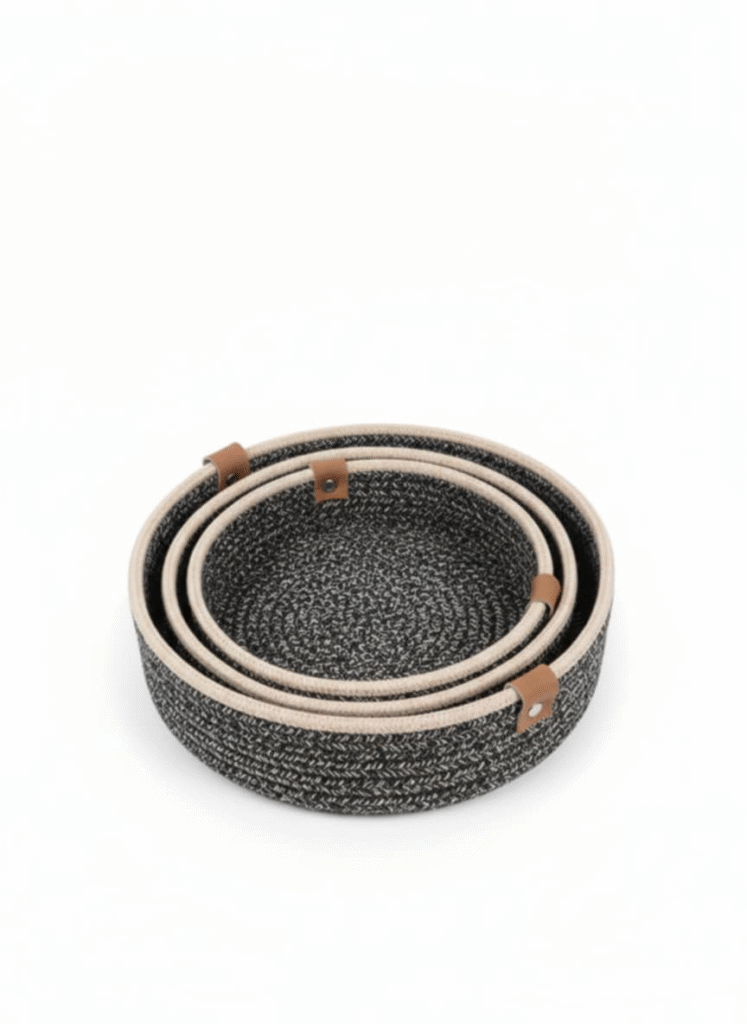 Apportez une touche d’élégance et de praticité à votre intérieur avec cet ensemble de trois paniers de rangement tressés avec couvercles. Conçus en corde textile résistante, ces paniers présentent un design moderne et naturel, sublimé par une association harmonieuse de gris foncé et de blanc cassé en bandes horizontales. Déclinés en trois tailles complémentaires, ils s’adaptent parfaitement à tous vos besoins de rangement : linge, plaids, jouets, accessoires ou objets du quotidien. Leurs couvercles assortis permettent de protéger le contenu de la poussière tout en conservant un espace bien organisé. Le petit panier est doté d’une anse pratique pour un transport facile. Robustes, légers et décoratifs, ces paniers s’intègrent aisément dans un salon, une chambre, une salle de bain ou un bureau, offrant une solution de rangement esthétique et fonctionnelle. ✔ Design moderne et naturel ✔ Trois tailles pour un rangement optimisé ✔ Couvercles inclus pour une meilleure organisation ✔ Idéal pour tous les espaces de la maison
