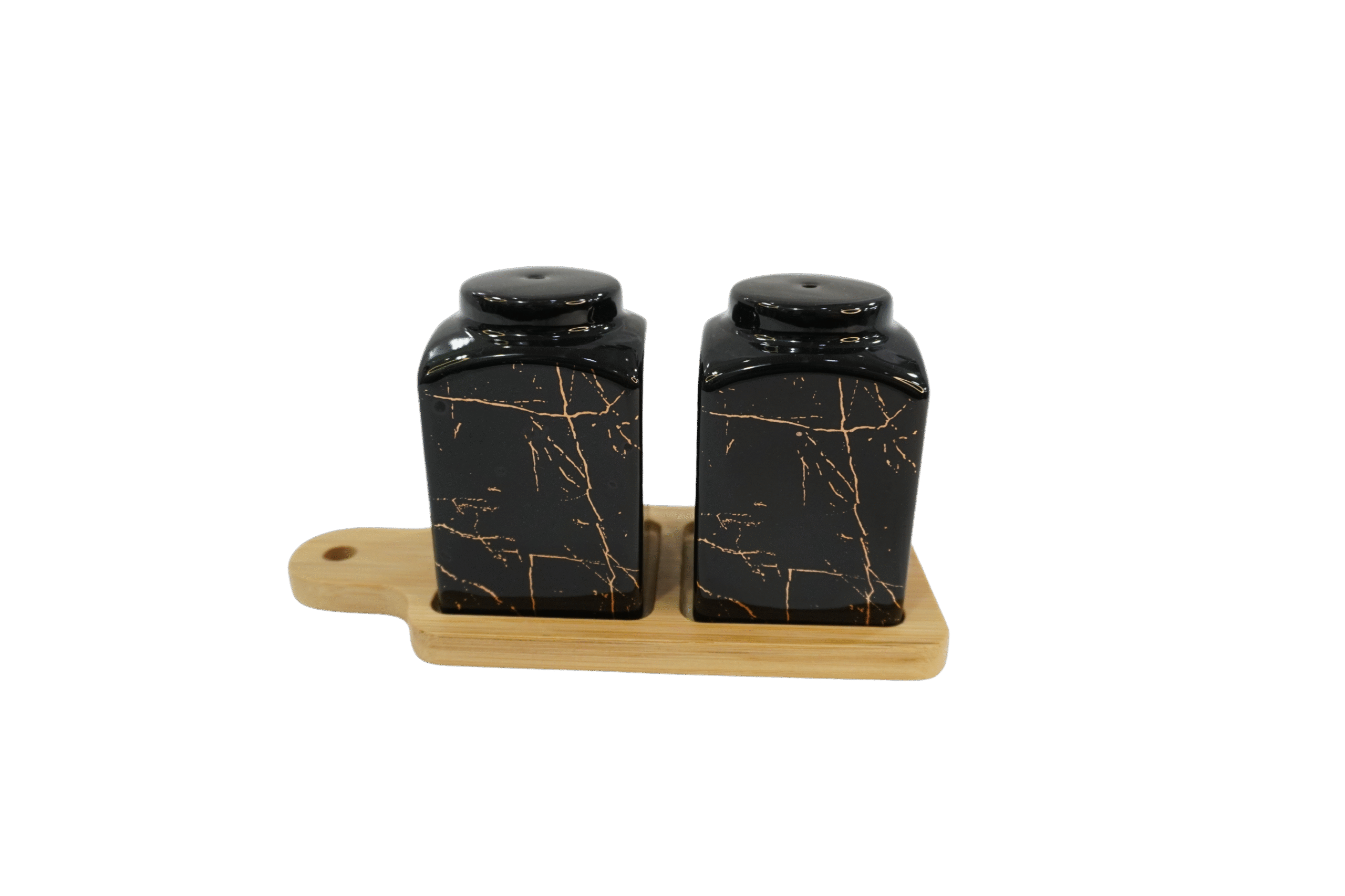Un élégant duo de salière et poivrière présenté sur un plateau en bambou au style faux marbre. Ce set haut de gamme ajoute une touche d’élégance naturelle et moderne à votre table :