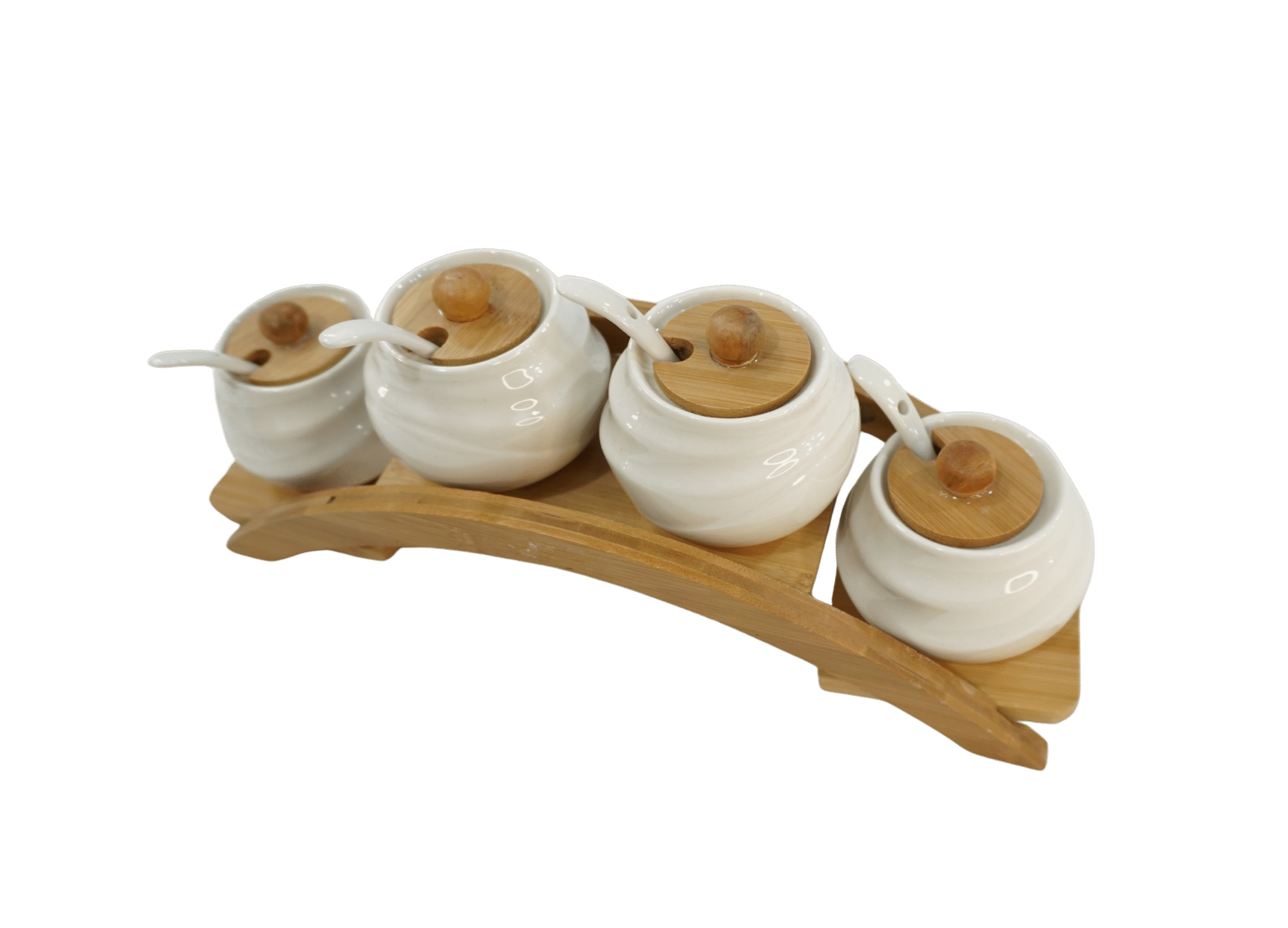 Apportez de l’élégance et de l’organisation à votre cuisine avec ce set de bocaux à épices en céramique. Chaque bocal est doté d’un couvercle en bambou naturel pour préserver la fraîcheur des condiments, et est étiqueté (sel, poivre, farine, épices) pour un repérage rapide. Le support en bois ajoute une touche chaleureuse et pratique, parfait pour garder vos ingrédients essentiels à portée de main. Idéal pour les cuisines modernes et traditionnelles.